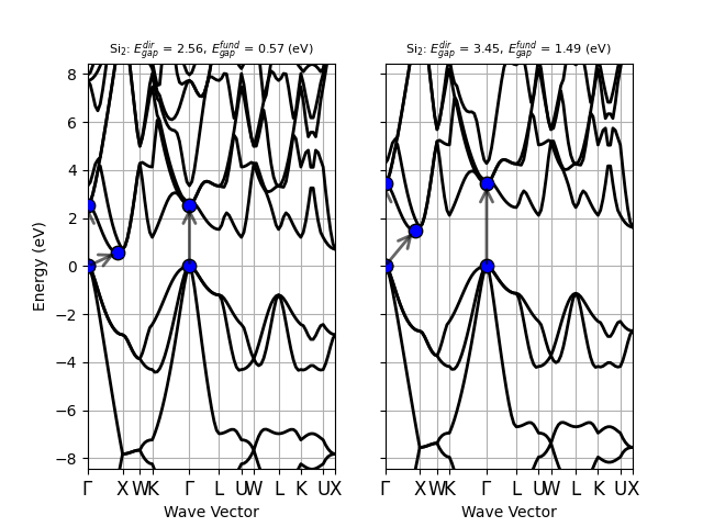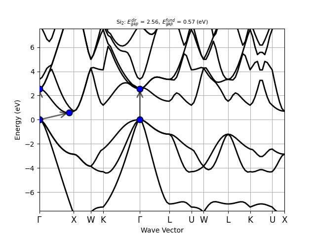 Silicon is an indirect band gap semiconductor: the CBM is located at the \(\Gamma\) point while the VMB is located at ~[+0.429, +0.000, +0.429]. At the PBE level, the direct gap is 2.556 eV while the fundamental band gap is ~0.570 eV. Both values strongly underestimate the experimental results that are ~3.4 eV and ~1.12 eV, respectively.